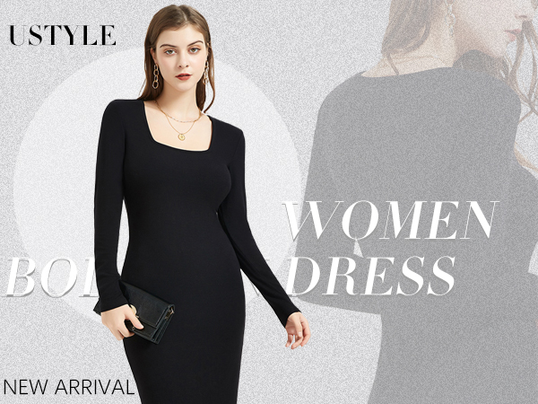 Amazon Com Ustyle Women S Ribbed Knitted Pullover Bodycon Fall Dress Low Square Neckline Long Sleeve Dress Party Cocktail Midi Black Dress Clothing Shoes Jewelry